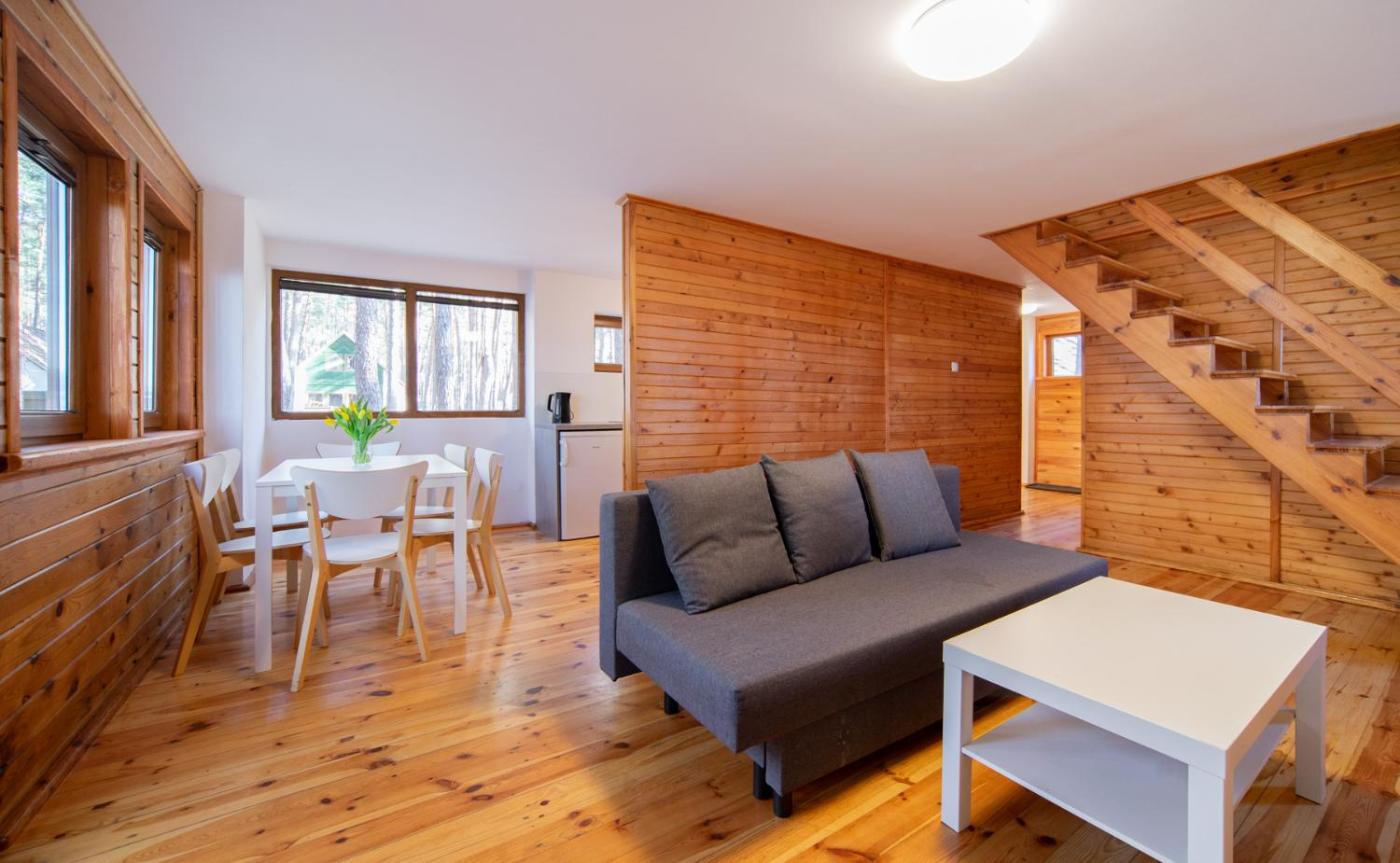 Domek typu Superior. Ten domek z oddzielnym wejściem mieści salon, 3 oddzielne sypialnie i łazienkę z prysznicem. We w pełni wyposażonym aneksie kuchennym przygotowano płytę kuchenną, lodówkę i przybory kuchenne. Ten domek z tarasem z widokiem na jezioro oferuje również telewizor z płaskim ekranem oraz zestaw do parzenia kawy i herbaty. Do dyspozycji gości jest 6 łóżek. Domek - 6 osobowy. Powierzchnia pokoju ok.: 60 mkw.
