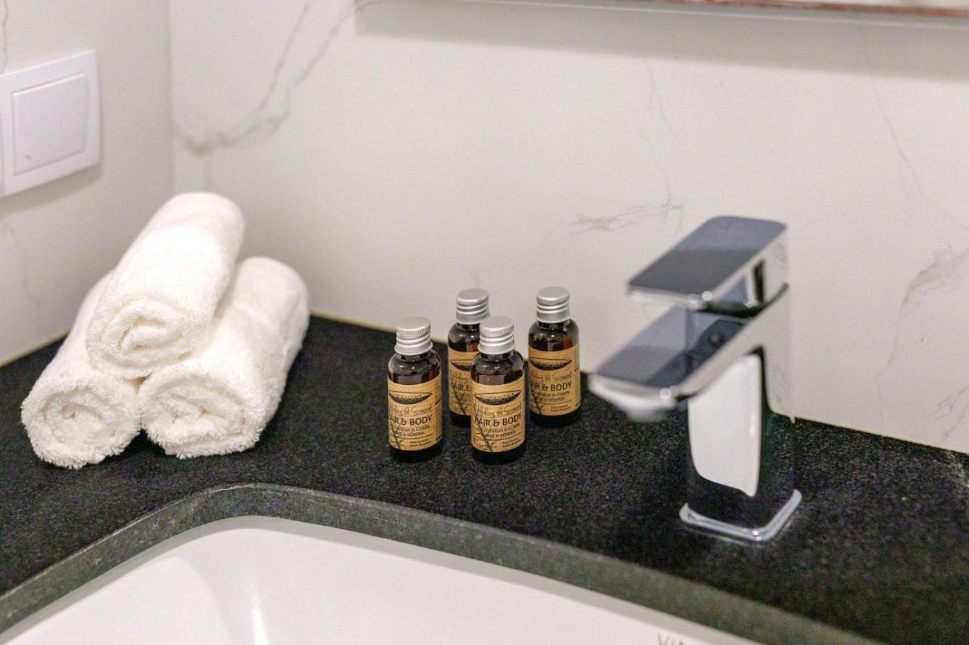 Oferta apartamentu obejmuje sypialnię (1), salon, kuchnię z pełnym wyposażeniem, w tym lodówką i ekspresem do kawy, a także łazienkę (1) z prysznicem oraz suszarką do włosów. W apartamencie zapewniono ręczniki i pościel.